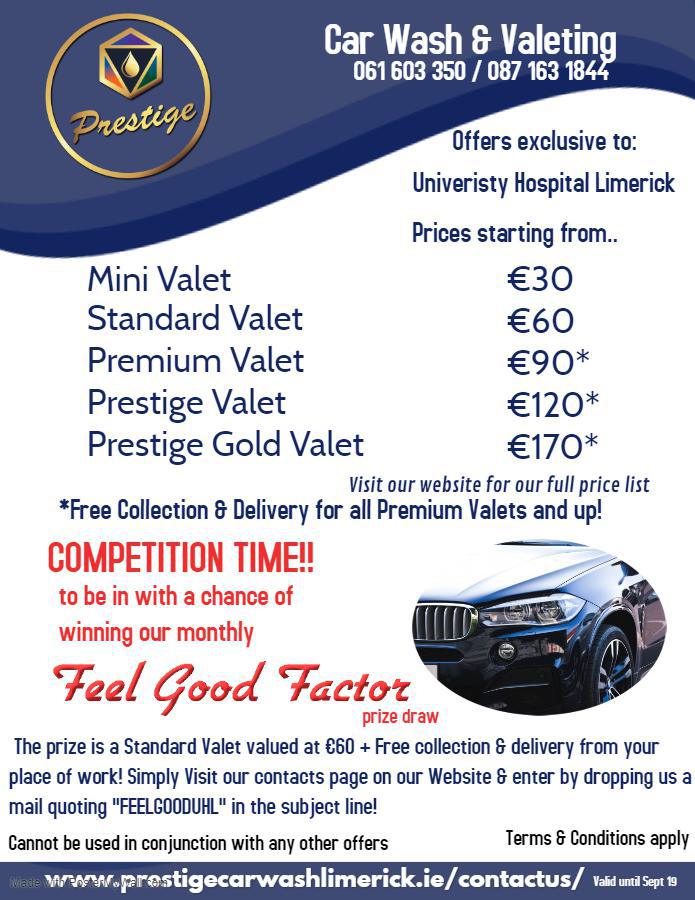 032 Prestige Car Wash. Before you head out of town this weekend stop by Prestige Car Wash and give the Family car a quick make over. Prestige car wash and valeting is situated in the heart of Limerick and has been working to provide their customers with valeting services for a long time.